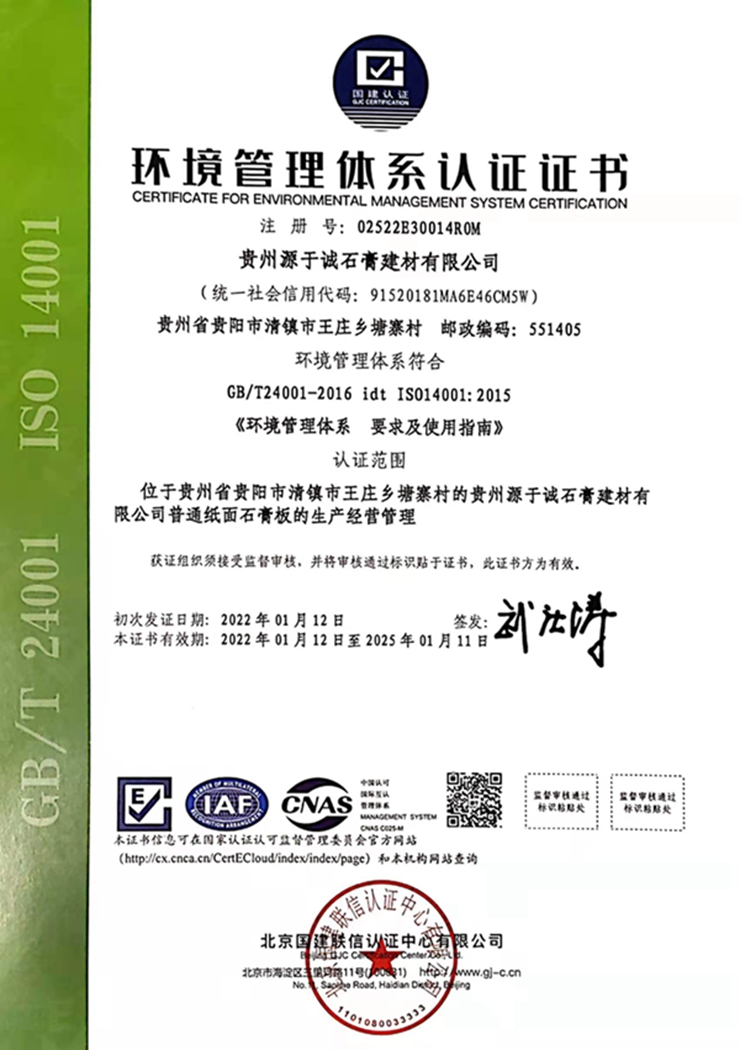 環(huán)境管理體系認證證書